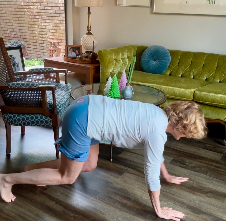On all fours, lift your knees and crawl — forward, backward, sideways. Hips low, core tight.